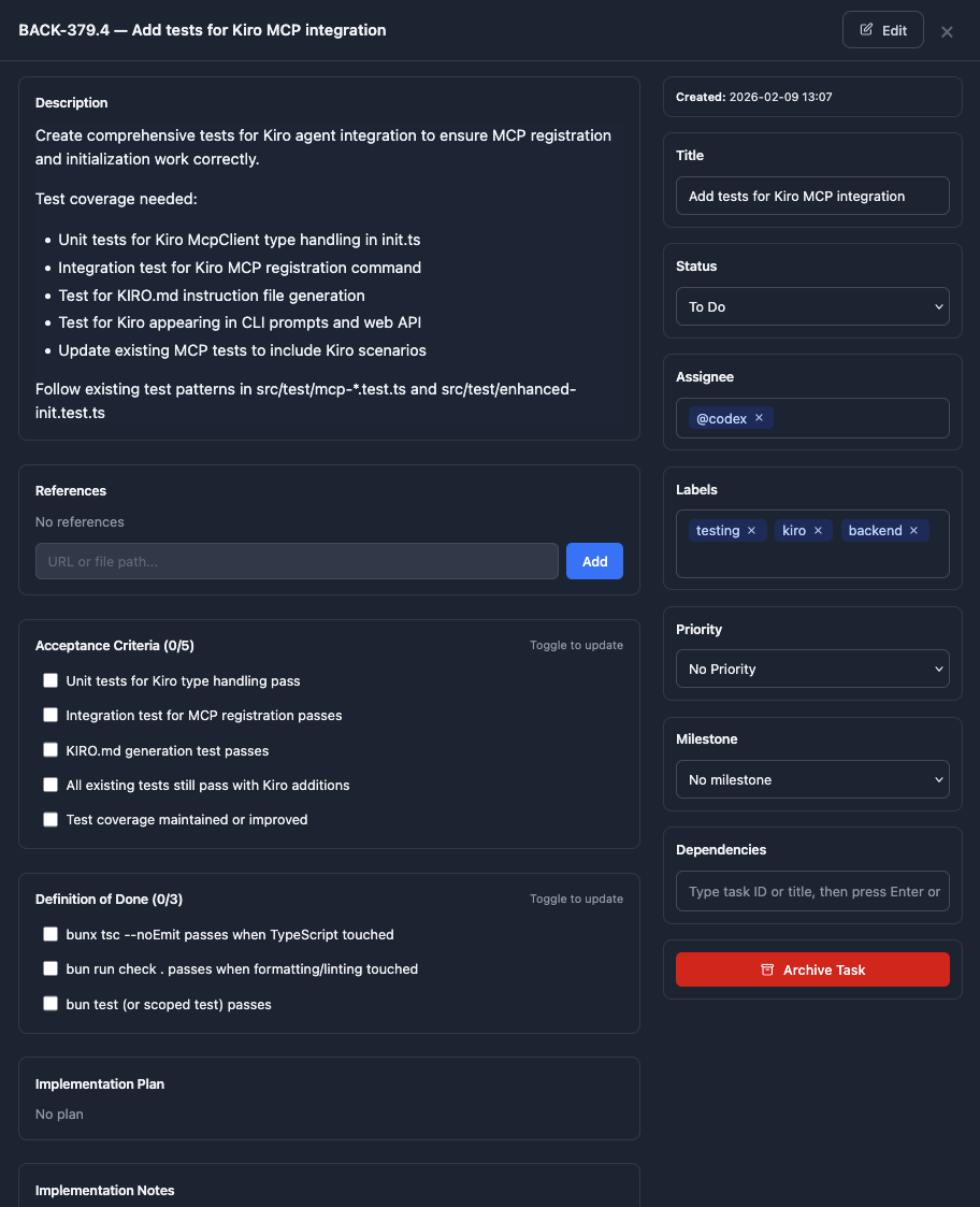 With this research output in my context and with the Backlog.md tools available, I was ready to start defining tasks to implement Kiro support. I prompted: Create the required tasks to add Kiro as an additional agent. Assume Kiro will work with MCP. Make sure you make updates to both the code and the documentation inside the repository.