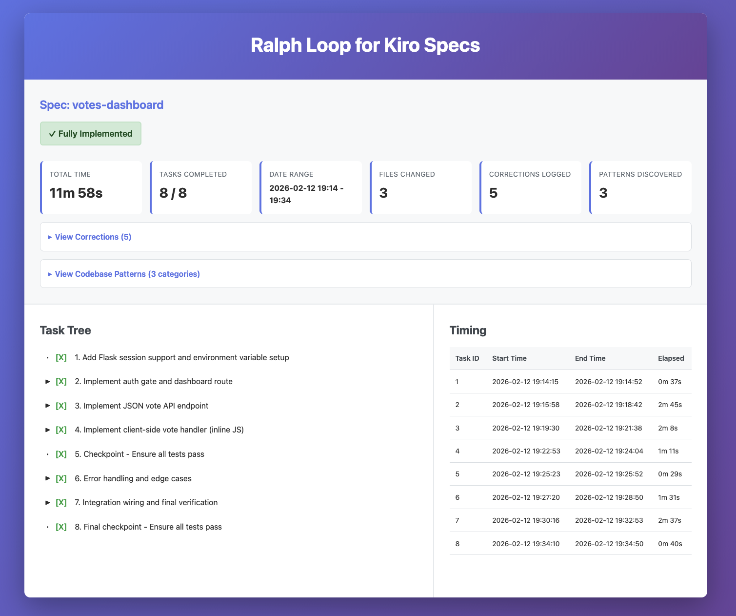 The fun thing about this is that, because you fully own the ralph-loop-kiro-specs-prompt.md (which is the execution logic), you can have that logic implement custom behaviors. Like, for example, you could have an instruction at the end of it that suggests to create a dashboard with a summary of the specs execution: